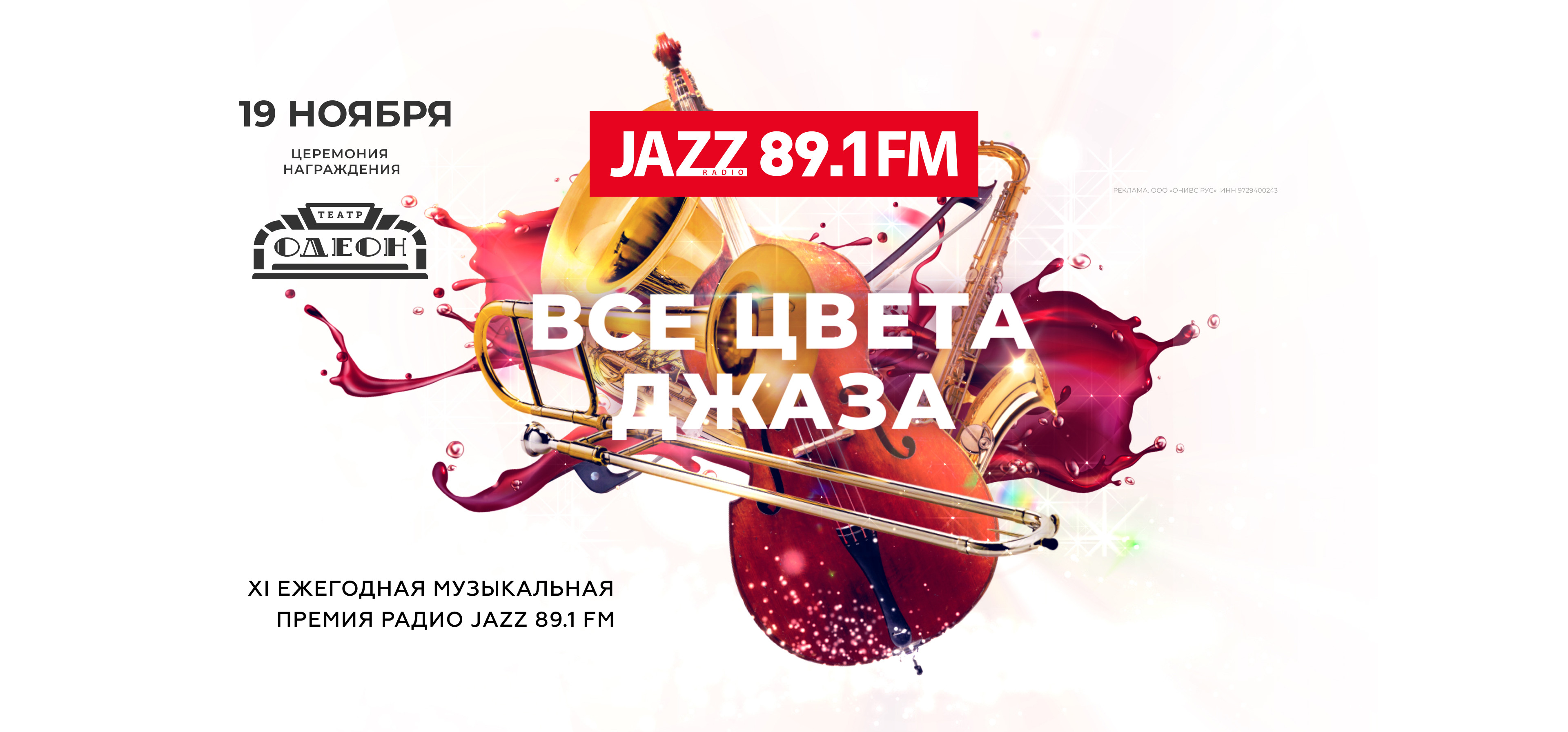 19 ноября на сцене театра «ОДЕОН» состоится церемония вручения XI ежегодной музыкальной премии Радио JAZZ «Все Цвета Джаза». В этот вечер самые яркие выступления, самые долгожданные альбомы и самые модные площадки будут отмечены наградой радиостанции. Ведущие: певица, композитор, актриса, теле-, радиоведущая Мариам Мерабова и джазовый певец, композитор Дмитрий Носков.